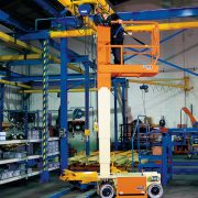 Masthoogwerker. De masthoogwerker gaat verticaal omhoog, maar heeft een extra optie. Zo is het met bepaalde typen mogelijk om 340 graden te draaien met het werkplatform zodat de positionering geperfectioneerd kan worden. Daarnaast hebben sommige typen aan het einde van de arm een jib. Deze zorgt ervoor dat er over obstakels heen gereikt kan worden. De stalen mast van de masthoogwerker is sterk en biedt goede ondersteuning voor het werkplatform. Dit is een van de meest veelzijdige hoogwerkers met een compacte bouw en is zeer goed te manoeuvreren bij kleine en moeilijk te bereiken ruimten.